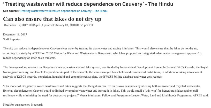 ‘Treating wastewater will reduce dependence on Cauvery’ Can also ensure that lakes do not dry up